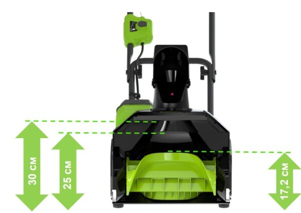 Время работы зависит от емкости батареи и характера снега. На одном заряде аккумулятора емкостью 8 А•ч снегоуборщик способен убрать покров высотой 10 см на 177 м². Если снег уже слежался или его глубина достигает 15 см, площадь сокращается до 141 м². При мокром и тяжелом снеге глубиной 20 см аппарат убирает 96 м².