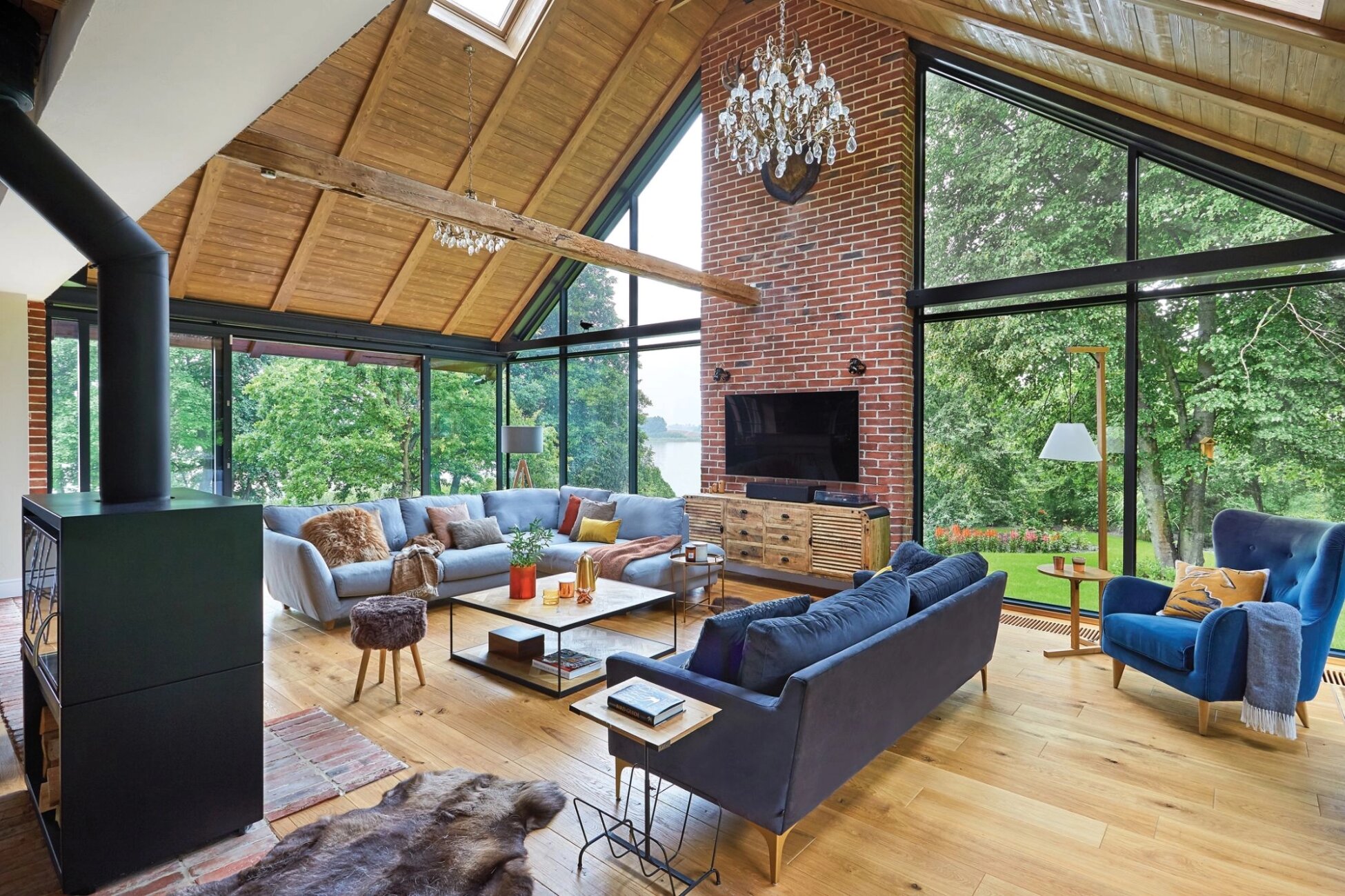 Застекленные углы веранды, откуда открывается вид на сад и озеро, потребовали создания сложной конструкции крыши и потолка.