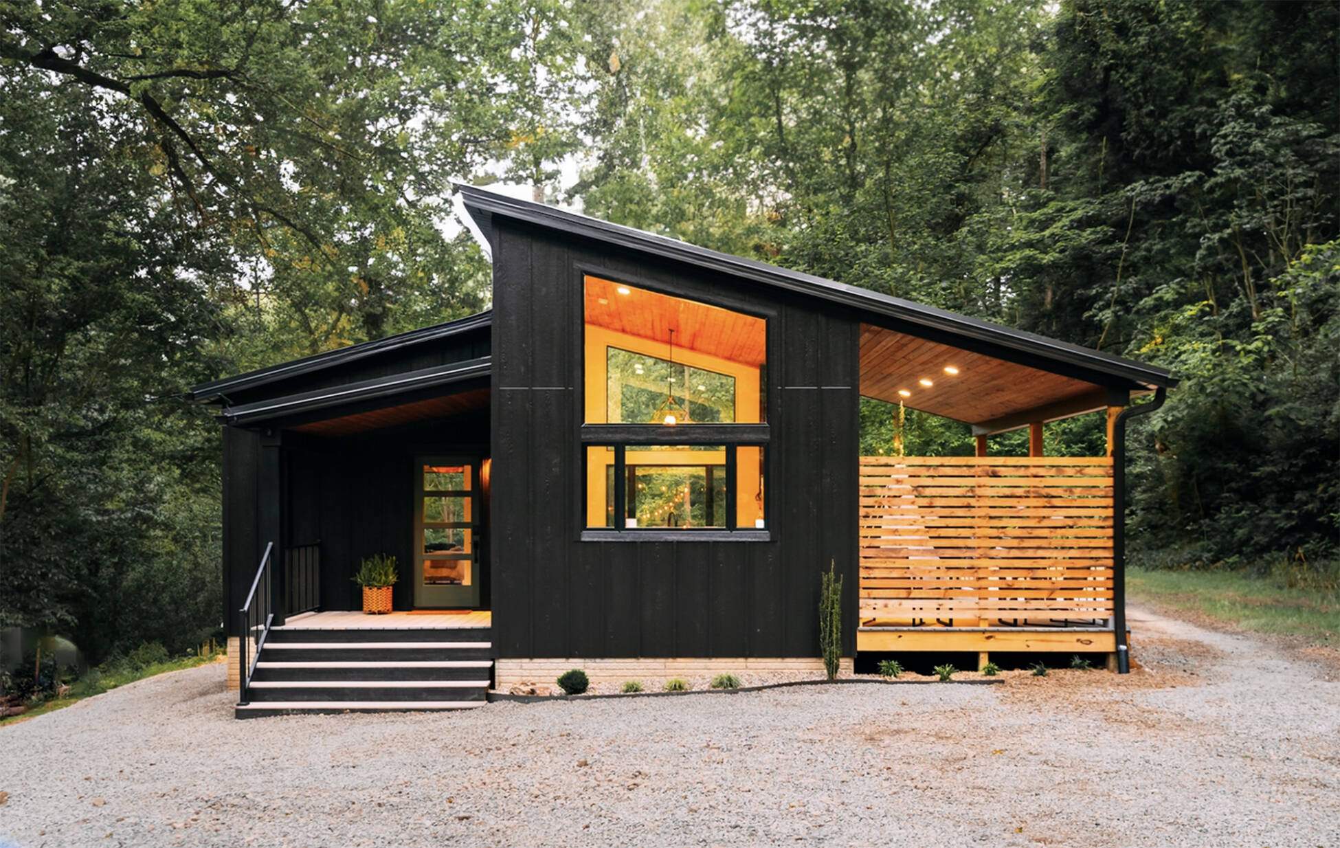 Небольшой домик площадью 46 м² имеет необычную форму и разноуровневую скатную крышу