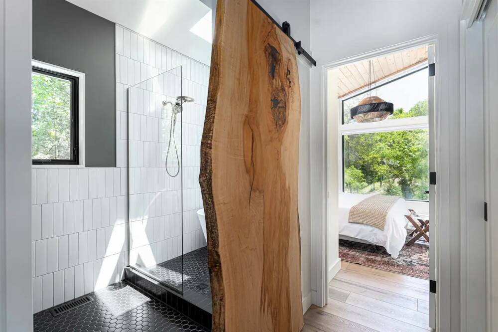 Собственники этой современной дачи пошли дальше. Они превратили свой загородный участок в настоящий оазис для релакса. Здесь можно посидеть перед огнем в гостиной, понежиться в джакузи под звездами, покачаться в необычном круглом гамаке, сделать барбекю и организовать душевную трапезу с близкими и друзьями на большой террасе, ну или просто погулять и насладится красивой природой. Ухаживать за насаждениями вообще не придётся, весь участок засыпан гравием, даже косить траву и приводить в порядок газон не требуется.