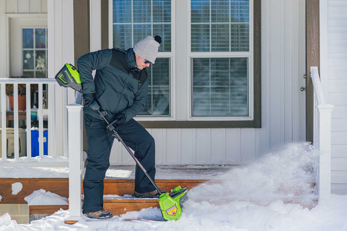 Ну а если нужно расчистить дорожку в отдалении от дома, электрический снегоуборщик становится и вовсе неудобным: тащить с собой бухту кабеля длиной в десятки метров — то еще удовольствие.